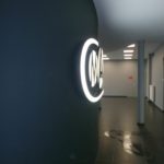 Logo de la Chambre des Métiers réalisé en lettres boitiers lumineuses de faible épaisseur : Chants en alu laqué et face en PMMA blanc diffusant, éclairage intérieur par leds teinte blanche. Enseigne fixée sur mur intérieur arrondi par entretoises adaptées et intégrées à la couleur du mur.