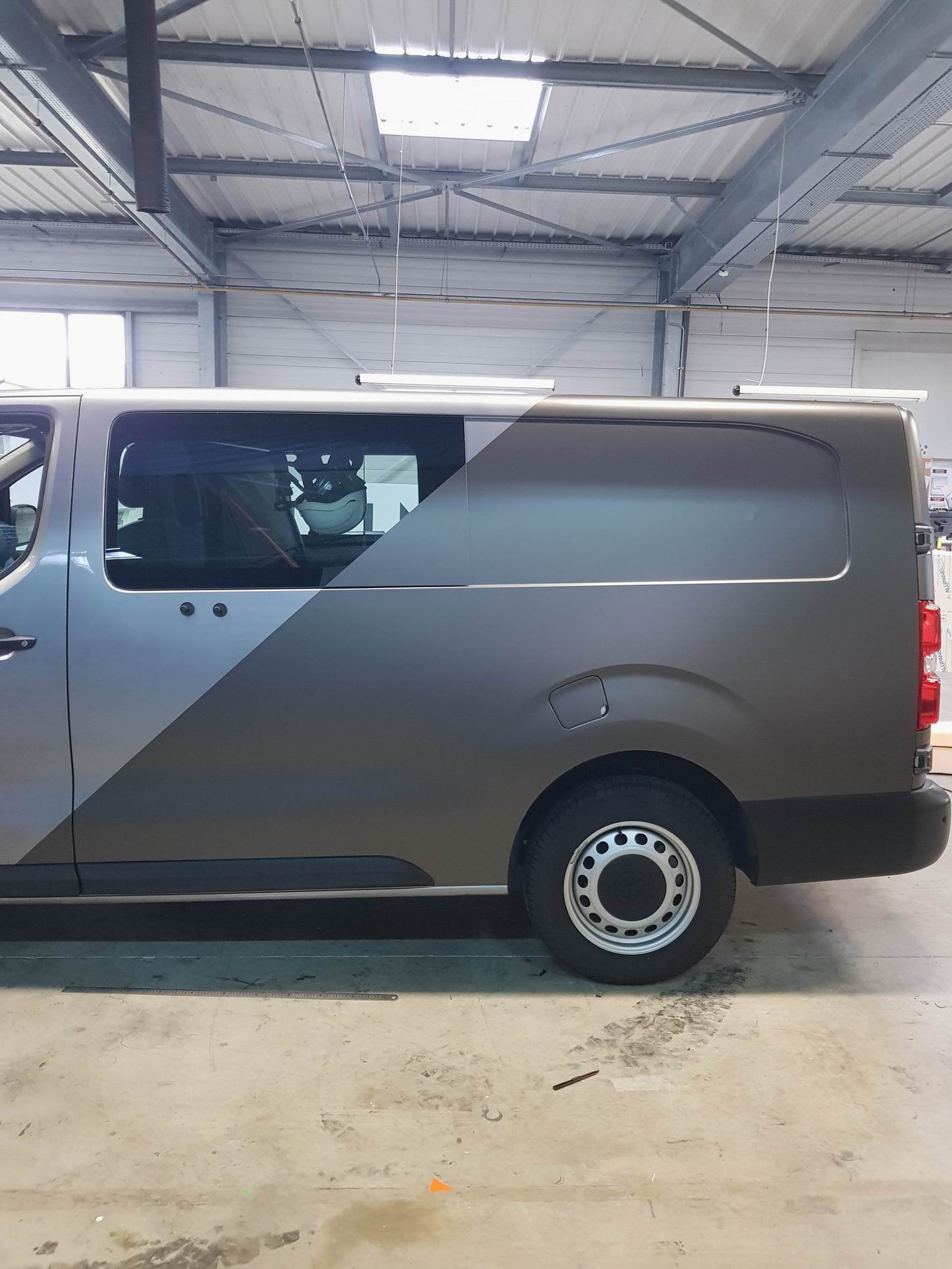 Choix de textures et couleurs pour un covering véhicule vraiment unique : Ici film de fond mat aspect acier et inscriptions en brillant pour un design très réussi