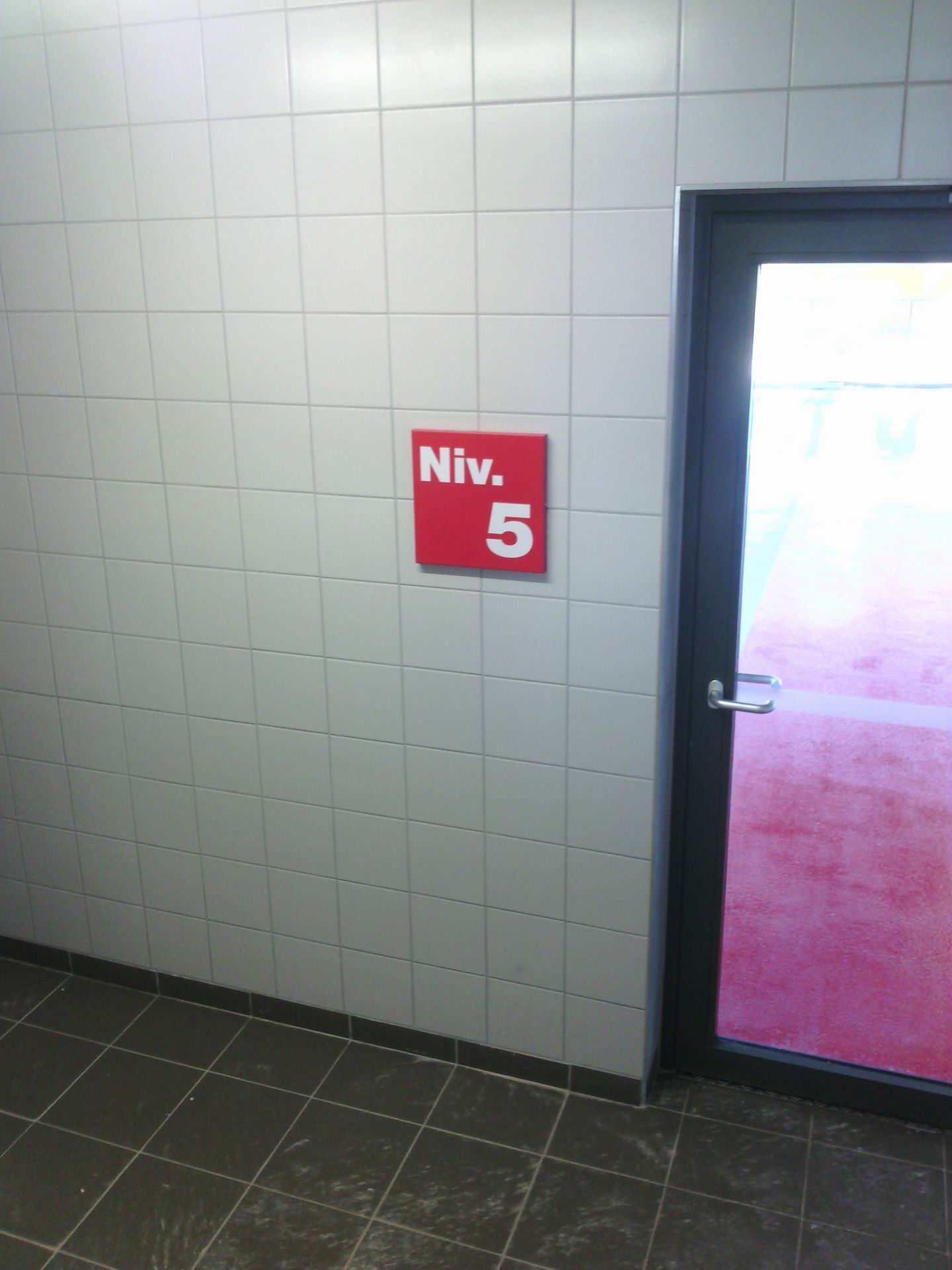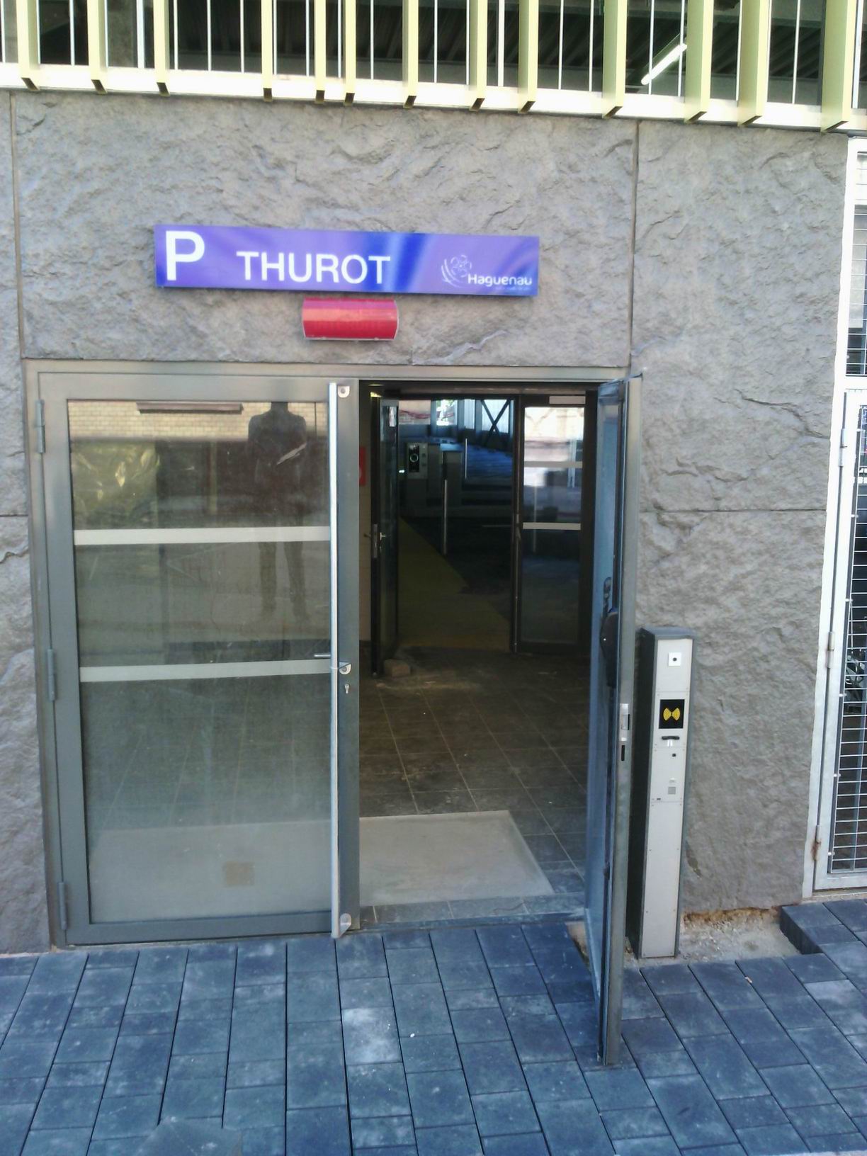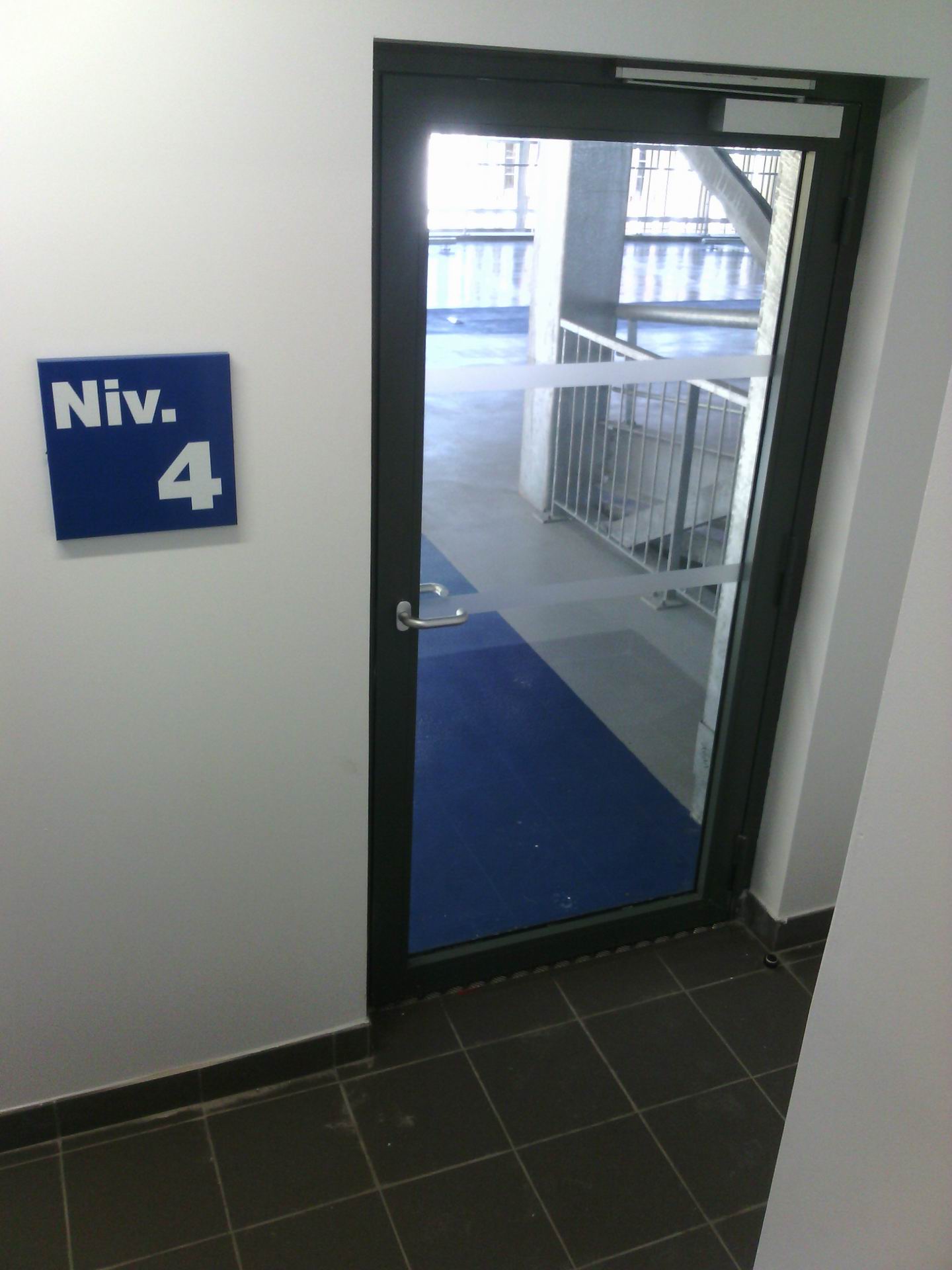 Il en est de même pour les bandes de sécurité sur les vitres en film dépoli comme réalisées dans ce parking.